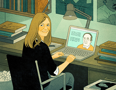 Cover illustration for an article by well-known author, Joyce Maynard, about her experience taking James Patterson's online master class in writing.