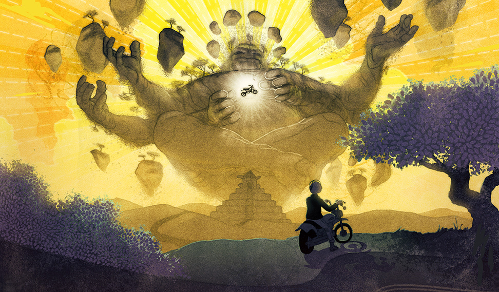 God of dirt illustration for an article about how riding a dirt bike can help improve safe motorcycle riding on the road. Art Director: Laura Milton Client: Cycle World Magazine