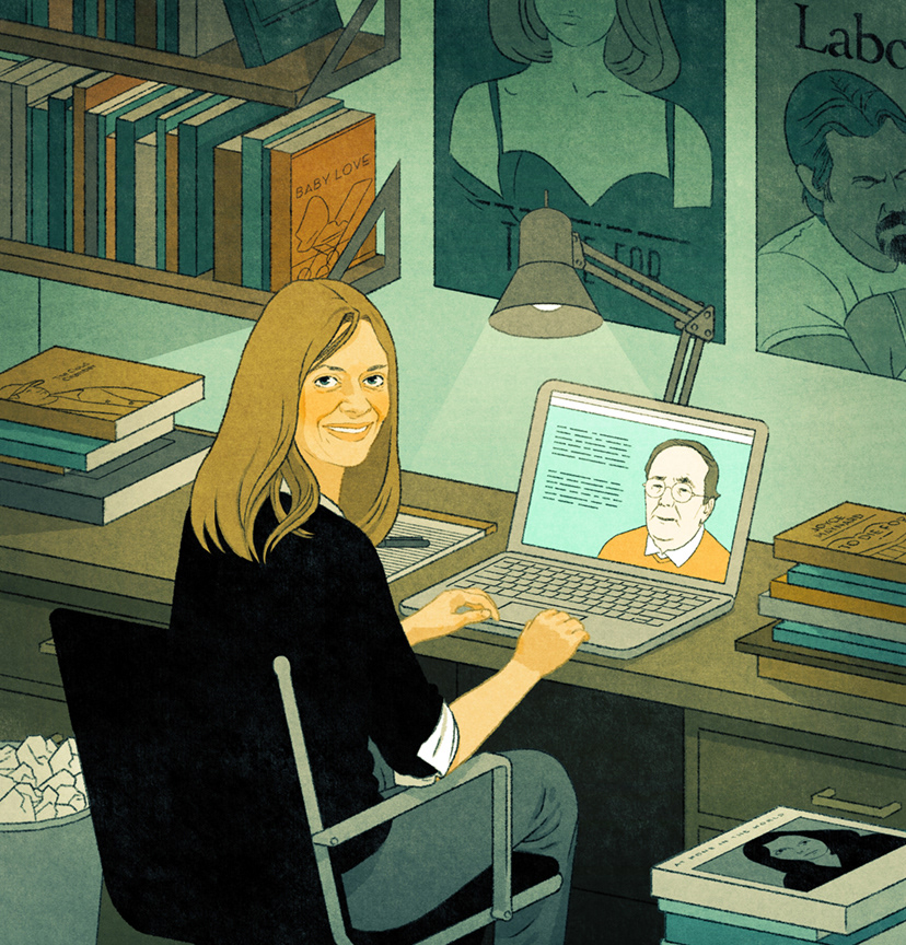 Cover illustration for an article by well-known author, Joyce Maynard, about her experience taking James Patterson's online master class in writing. Client: New York Observer Art Director: Lauren Draper